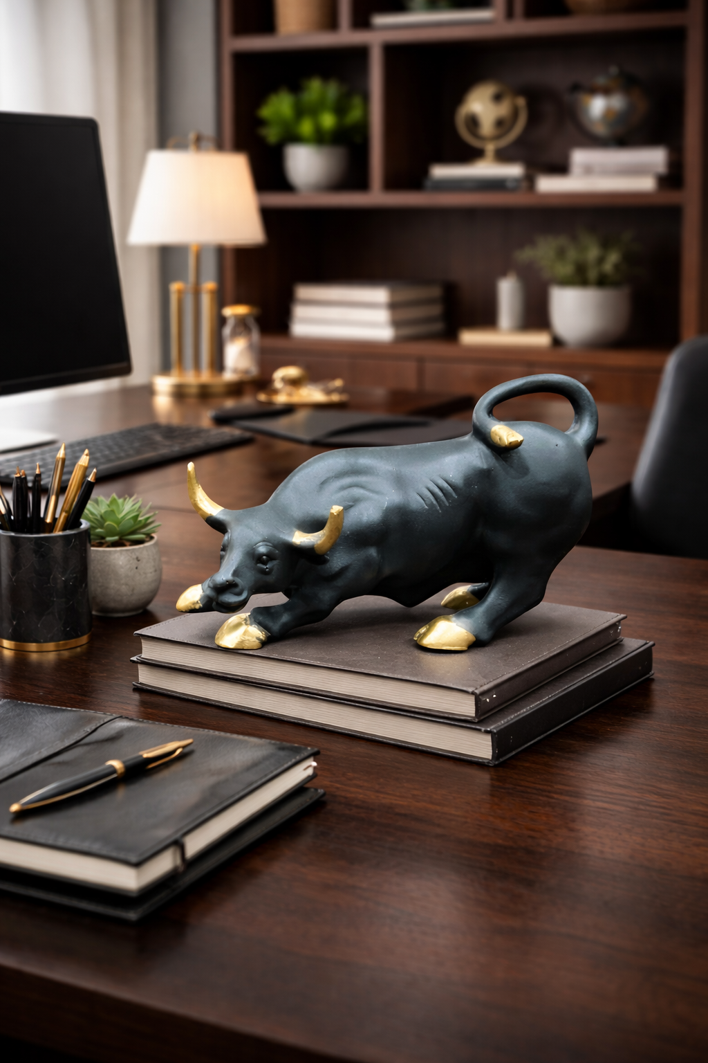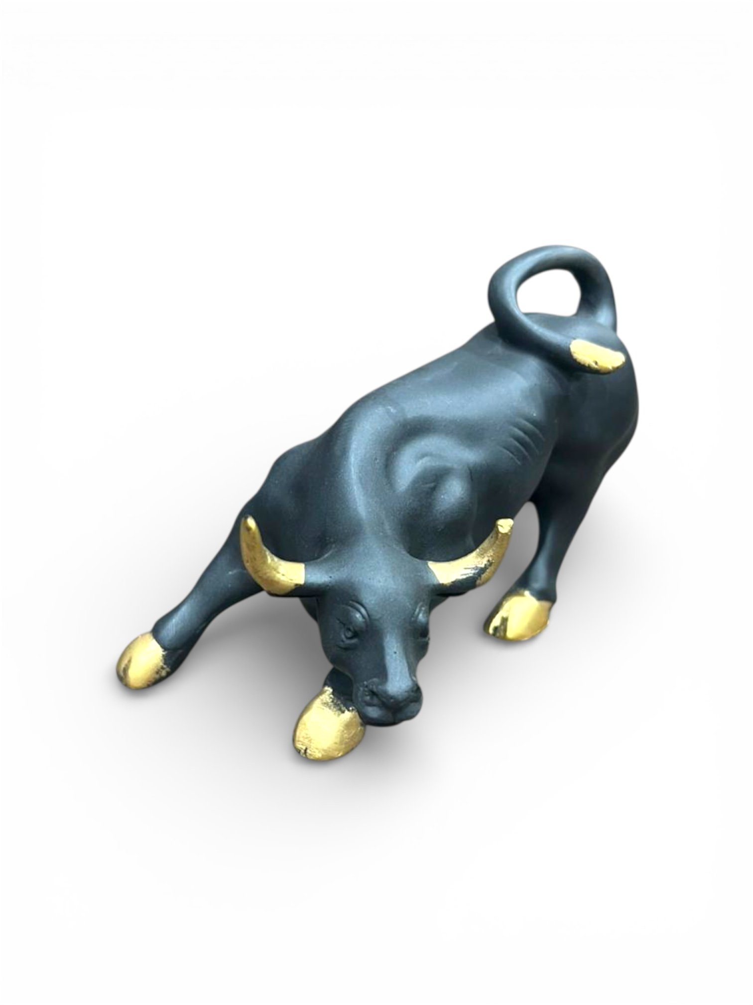 “Symbolising power, determination, and unstoppable progress, this Charging Bull Idol embodies strength in motion and fearless ambition. The forward-leaning posture reflects courage, resilience, and the drive to overcome obstacles — making it a powerful representation of growth, success, and confident energy. Crafted in a sophisticated matte black finish with refined gold accents, the sculpture balances boldness with elegance. The muscular form, sculpted detailing, and dynamic stance enhance its commanding presence, while the minimal yet luxurious design makes it a timeless décor piece suitable for both modern and classic interiors. Energetically, the charging bull represents prosperity, financial growth, and sustained momentum. Its powerful symbolism encourages confidence, focus, and forward movement, making it especially meaningful for professionals, entrepreneurs, and goal-oriented spaces. Blending spiritual symbolism with contemporary design aesthetics, this idol elevates interiors with a sense of strength and refined luxury. Whether styled as a desk accent or a living room statement piece, it brings dynamic energy and visual sophistication.”