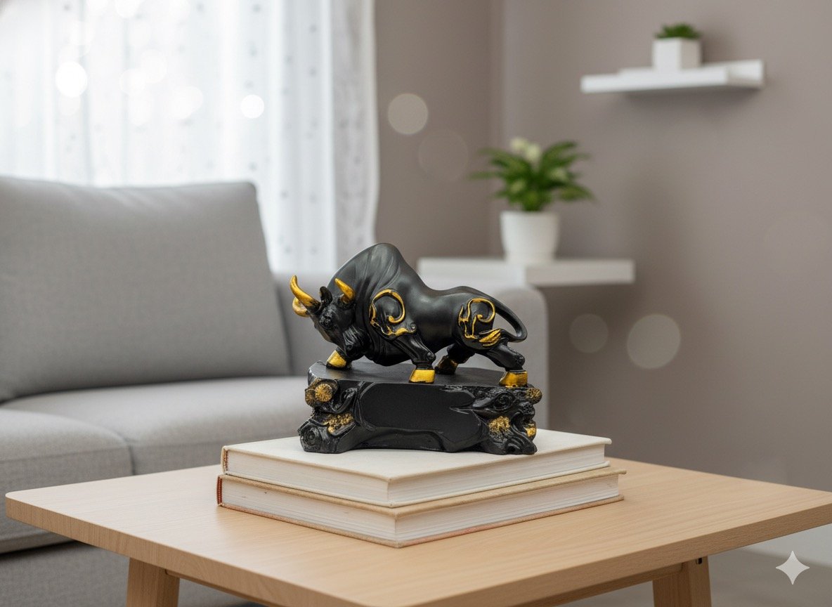 Symbol of power, wealth, and determination, this Black & Gold Charging Bull embodies success and unstoppable energy. Crafted in fine resin with intricate detailing, its strong stance represents growth and confidence — a perfect piece for your home, office, or workspace. Ideal for entrepreneurs, leaders, and achievers who believe in moving forward with strength and focus. Placement Tip: Place the bull in the Southwest direction of your office, study, or living space to attract financial prosperity, progress, and stability. It is also believed to boost career growth and business success when placed facing North or East.