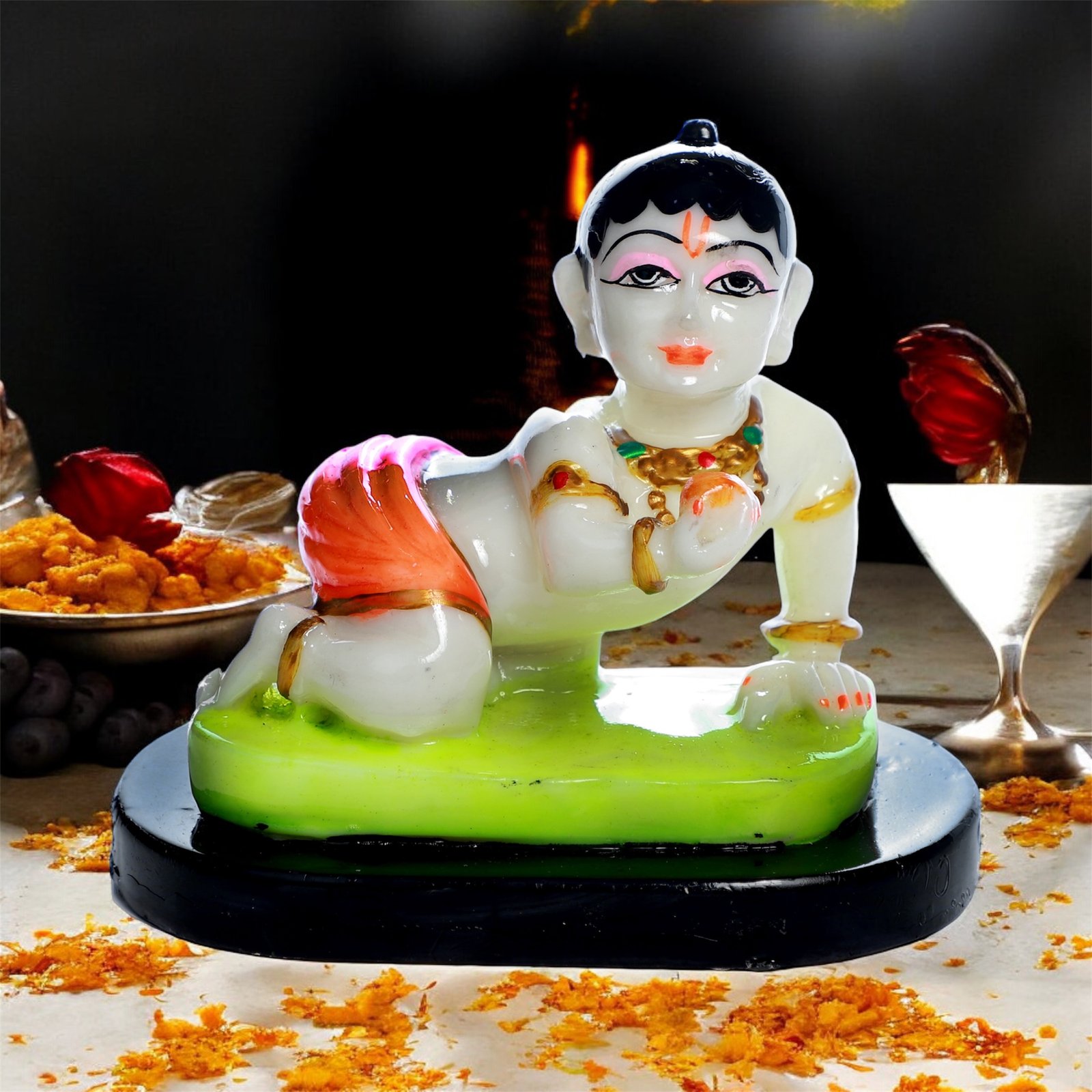 A beautifully crafted Crawling Bal Krishna idol depicting the divine child in a playful pose, symbolizing innocence, love, and joy. Made from premium-quality resin in a vibrant multicolour finish, this idol adds a divine and heartwarming touch to any home décor. Perfect for temples, living rooms, or gifting, it brings blessings of happiness, purity, and prosperity.