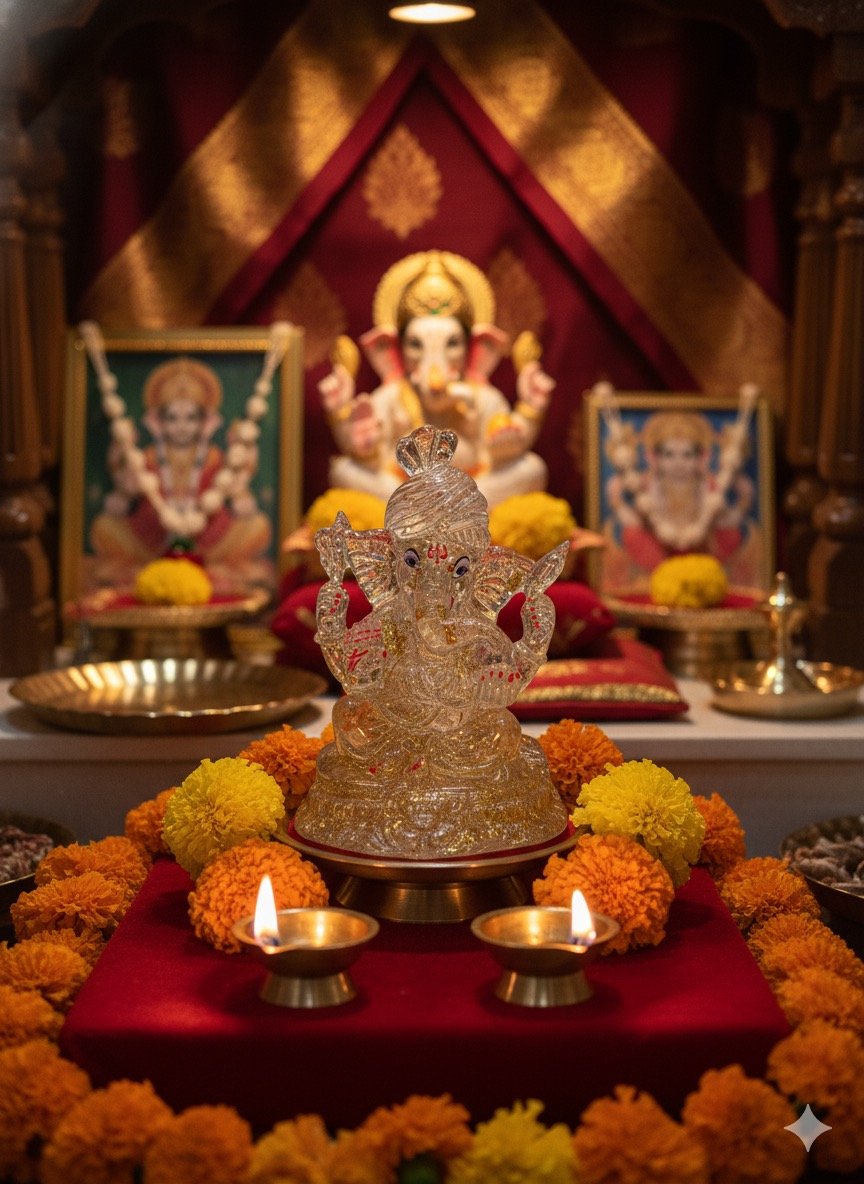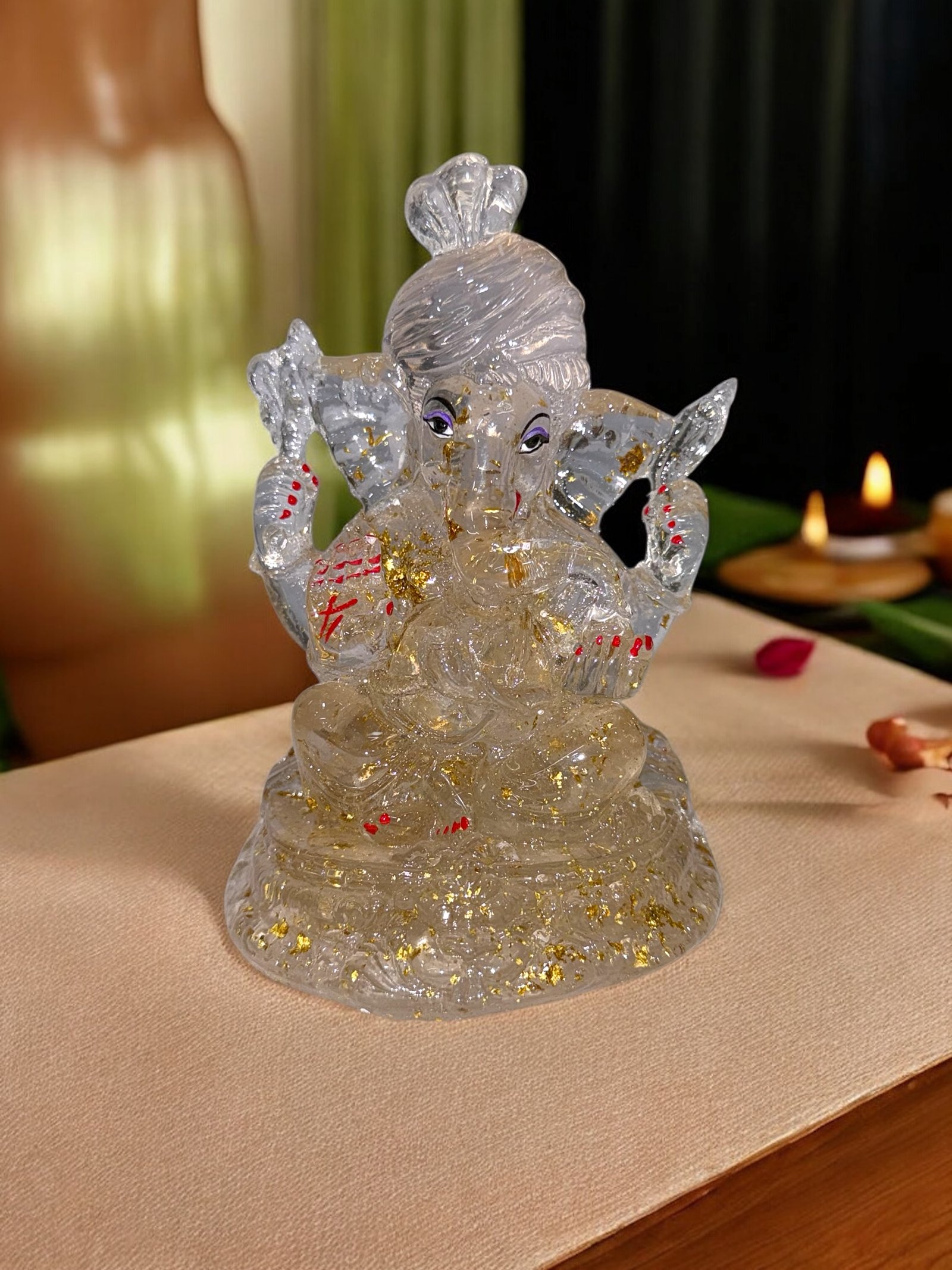 Invite divine grace into your space with this Crystal Ganesha Idol, symbolizing wisdom, new beginnings, and protection. Crafted in translucent resin with delicate gold and red detailing, this radiant idol beautifully reflects light — creating a serene aura of positivity. Perfect for home temples, office desks, or festive décor, it exudes purity and peace wherever placed.