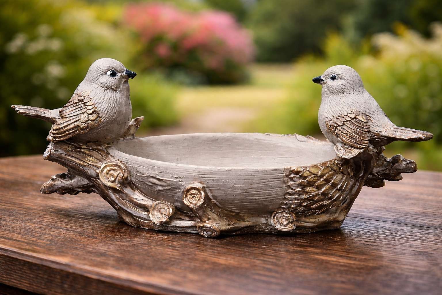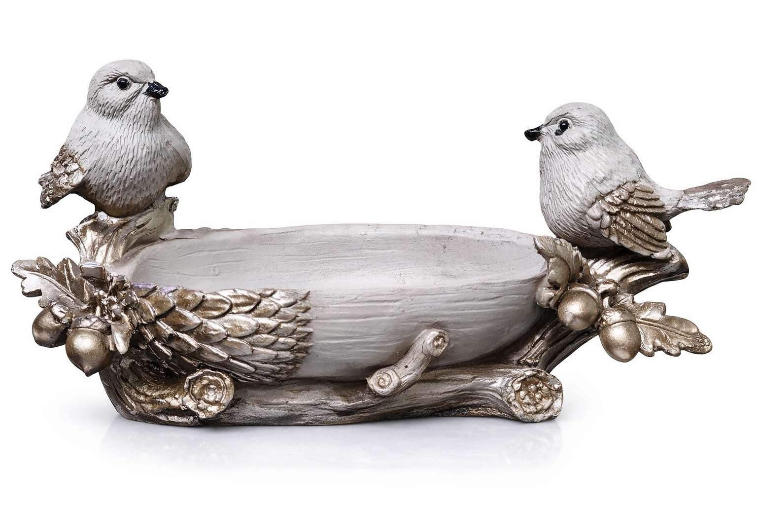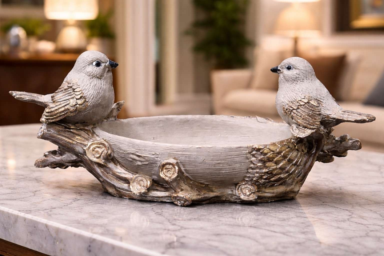 “Gracefully sculpted with two delicate birds perched on either side, this Twin Bird Decorative Bowl blends nature’s calm with refined craftsmanship. Finished in soft ivory tones with subtle antique gold accents, the bowl is inspired by woodland textures—branches, leaves, and gentle avian forms—making it a timeless accent for sophisticated interiors. The shallow bowl design allows versatile use, whether styled as a decorative accent or a functional holder. Its neutral palette pairs effortlessly with modern, classic, and transitional décor themes, adding quiet luxury without visual clutter.”