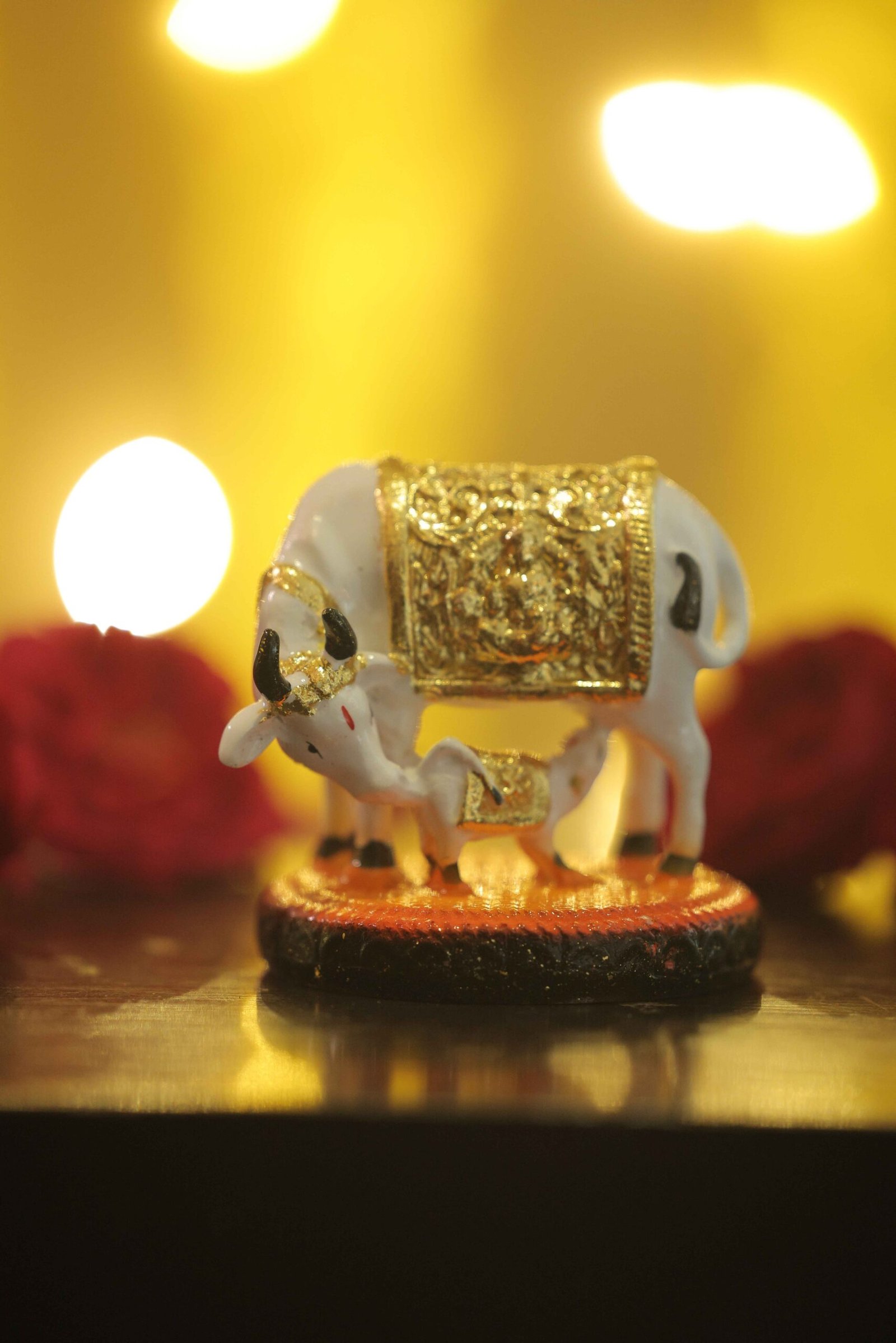 “Bring home divine abundance and nurturing energy with this beautifully crafted Kamdhenu Cow & Calf Idol, symbolising prosperity, nourishment, and unconditional care. Kamdhenu, revered as the sacred wish-fulfilling cow, is depicted here with her calf—representing wealth accompanied by continuity, growth, and protection. Finished in an elegant white base with antique gold embellishments, the idol features intricate detailing on the saddle and ornaments, reflecting grace and spiritual richness. The gentle posture of the cow and calf evokes peace, abundance, and maternal blessings, making this idol a powerful yet subtle spiritual accent for your home or workspace. Compact in size yet rich in symbolism, this Kamdhenu idol blends devotion with refined décor aesthetics.”