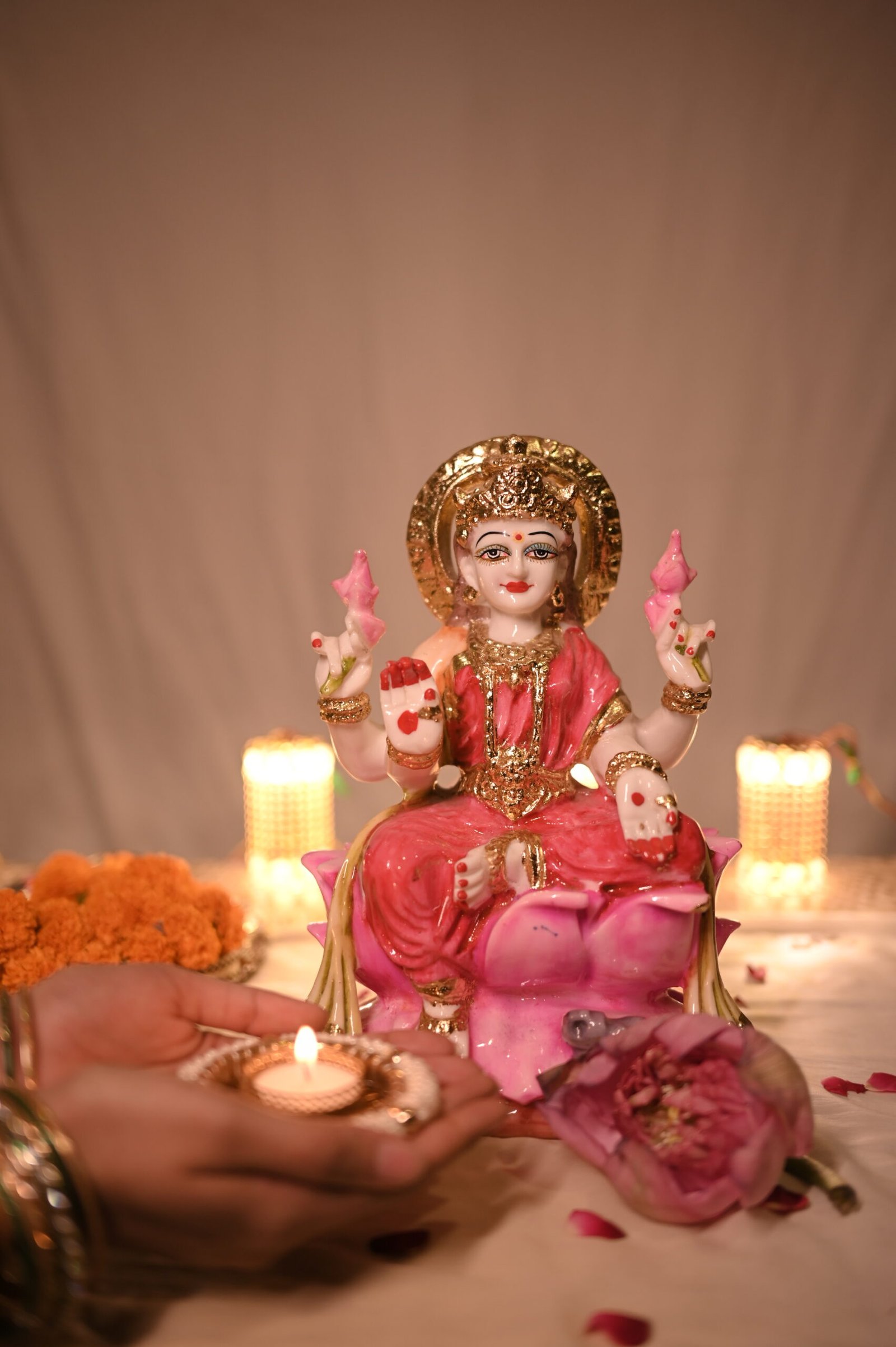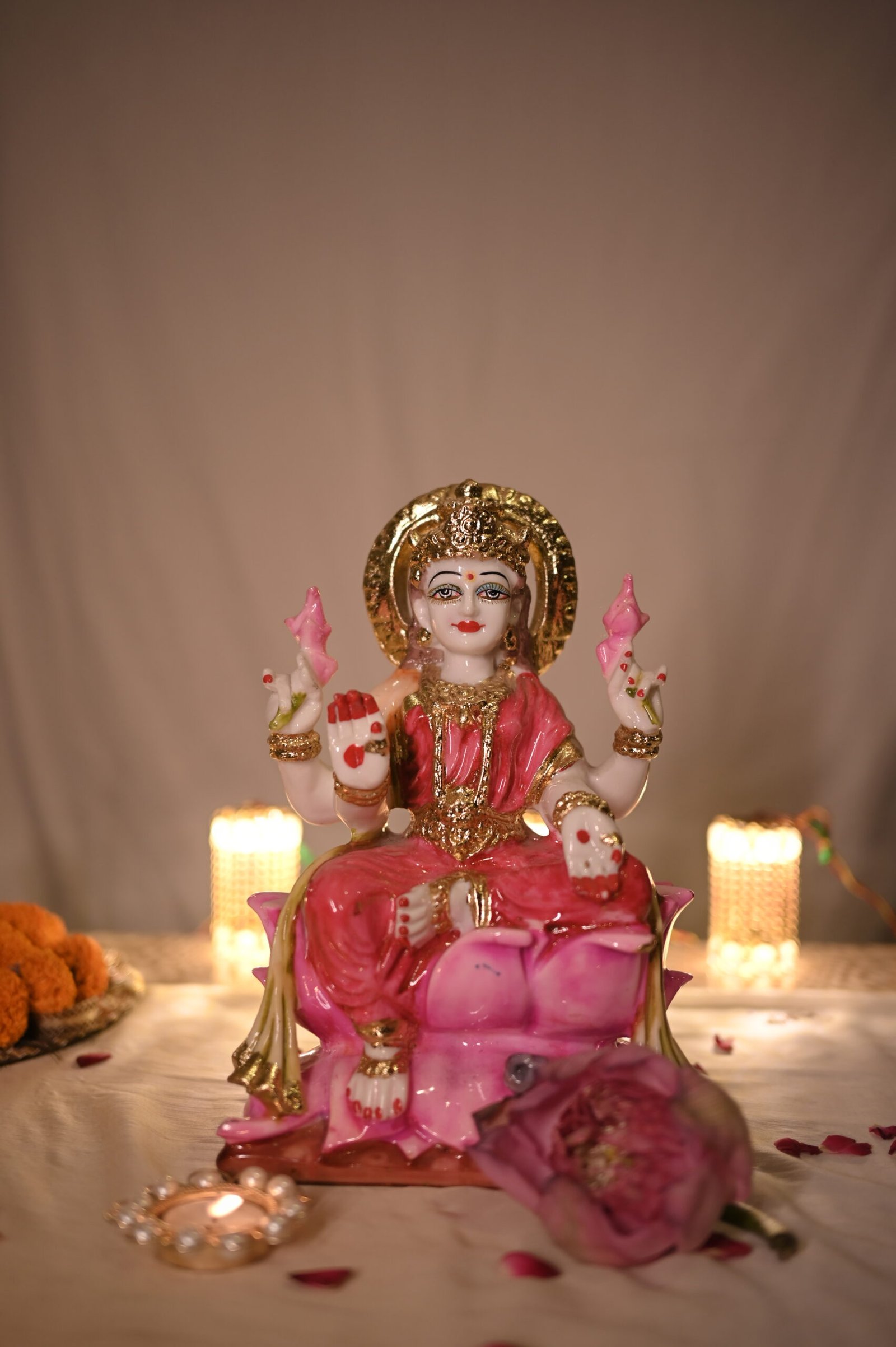 Invoke divine blessings of wealth and abundance with this beautifully handcrafted Lakshmi Mata idol. Made from premium resin and finished in radiant pink and gold tones, the idol symbolizes prosperity, purity, and spiritual grace. Perfect for pooja rooms, home décor, or festive gifting, this piece brings serenity and divine charm to any space. Placement Tip: Keep the idol in the North-East (Ishan Kon) direction or facing East in your home, temple, or office for wealth, peace, and prosperity. It enhances positivity and ushers in good fortune when placed near the entrance or in the prayer area.
