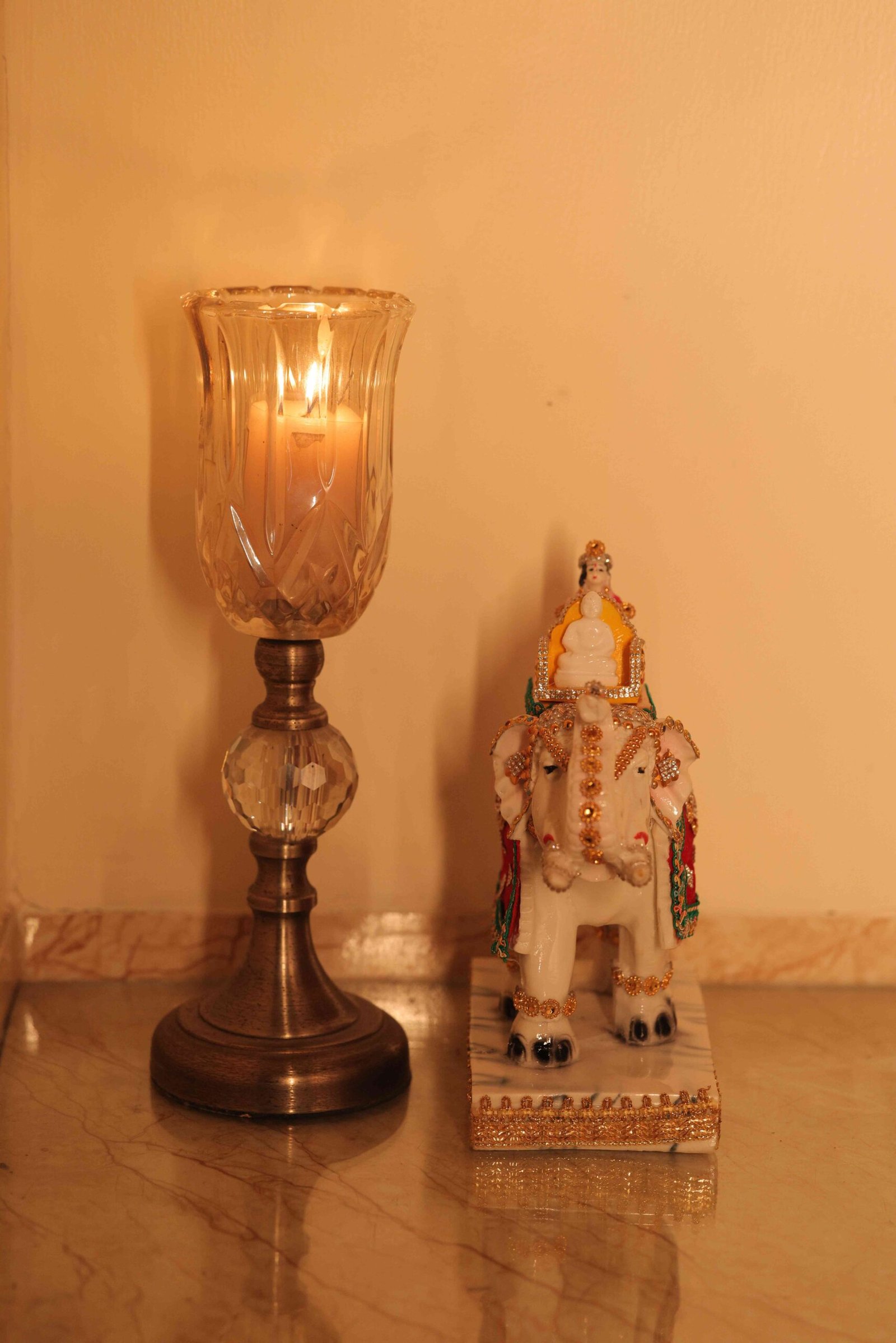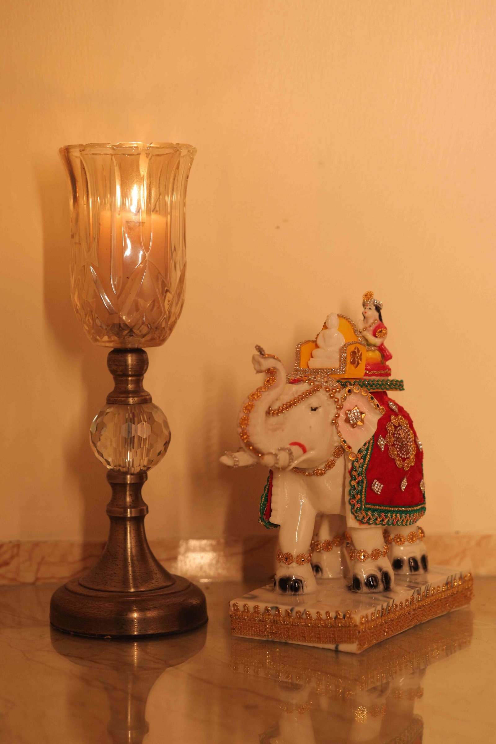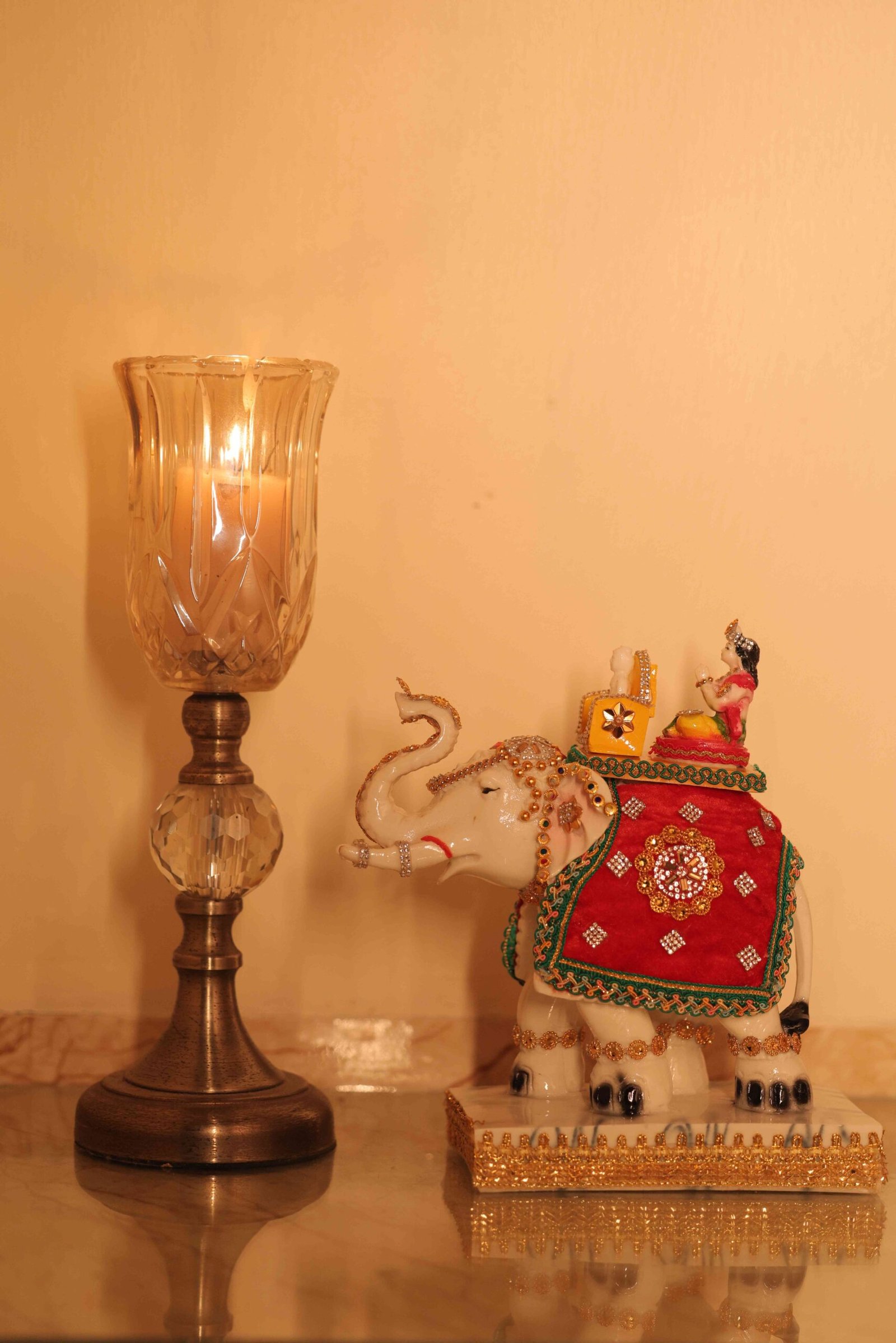“Experience serenity, discipline, and spiritual elevation with this beautifully crafted Lord Mahavir Idol on Elephant, symbolising supreme wisdom, non-violence, and inner strength. Depicted in a calm meditative posture atop a gracefully adorned elephant, this idol reflects the Jain values of balance between power and compassion. Finished with intricate hand-painted detailing, delicate embellishments, and traditional colours, the idol showcases refined craftsmanship and spiritual depth. The elephant represents stability, patience, and unwavering resolve, while Lord Mahavir embodies renunciation, enlightenment, and eternal truth. Resting on a polished base, this idol creates a dignified and peaceful presence, making it an ideal addition to sacred spaces as well as refined spiritual décor.”