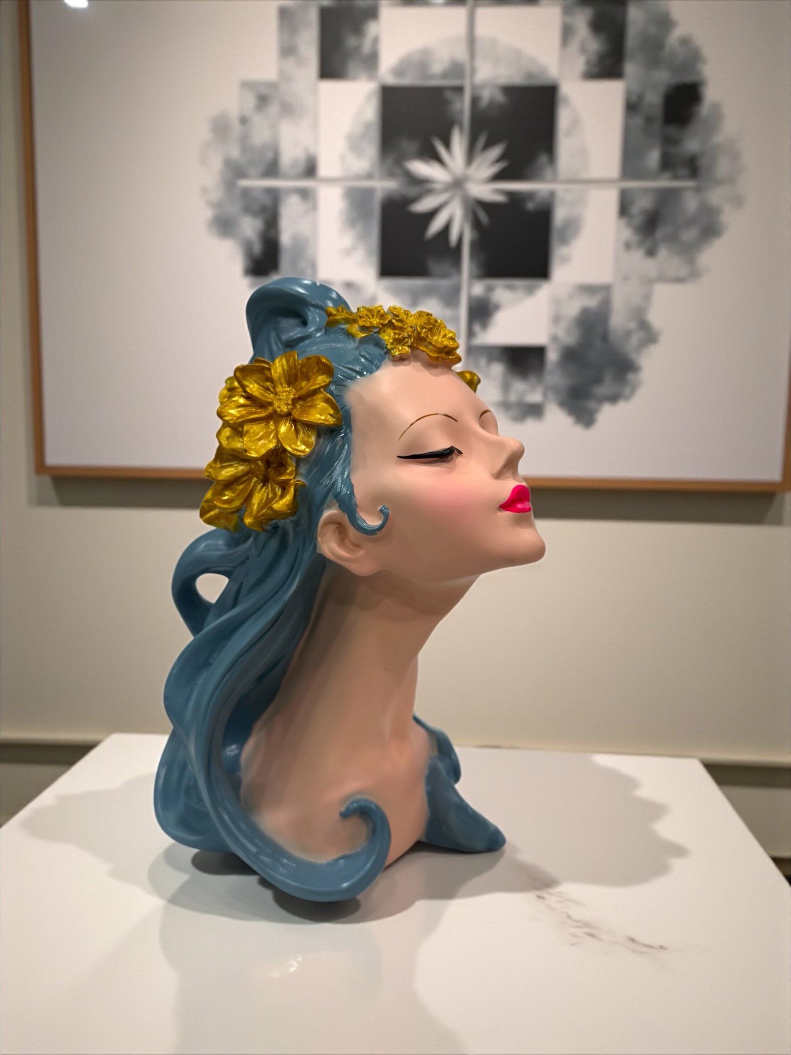 A stunning statement piece that embodies grace, elegance, and confidence, this modern art sculpture features a serene female face with flowing blue hair and golden floral accents. Crafted with precision, it adds a luxurious artistic touch to your home, office, or studio interiors. Perfect for console tables, corners, or art walls — it brings calm and creativity together in one timeless form. Placement Tip: Place this sculpture in the North or East direction of your living area or workspace to enhance creativity, peace, and inspiration. Ideal for those who appreciate modern art that connects emotion with aesthetics.
