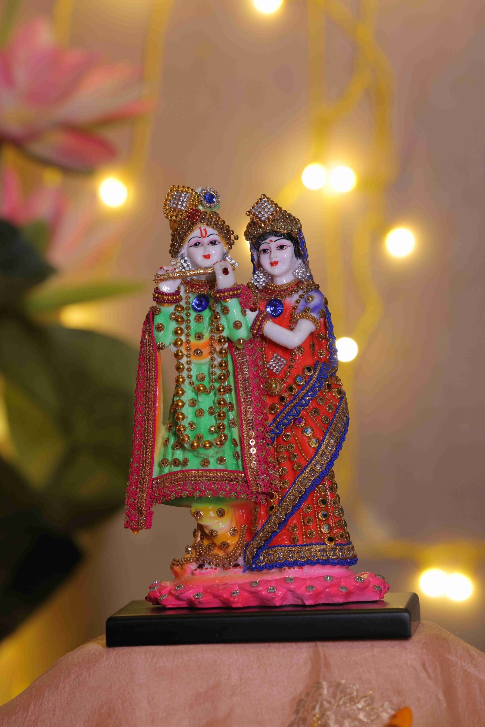 “Invoke the grace of eternal love and divine companionship with this exquisitely crafted Radha Krishna Idol, portraying Lord Krishna playing the flute beside Radha in a gentle, harmonious posture. Finished with intricate hand-painted detailing, rich jewel tones, and ornate embellishments, this idol reflects devotion, balance, and spiritual elegance. Standing on a lotus base symbolising purity and enlightenment, the delicate expressions, detailed jewellery, and flowing attire bring a sense of warmth and serenity to the piece. Compact yet visually captivating, this idol is ideal for both worship and refined décor, adding a soulful presence to any space.”