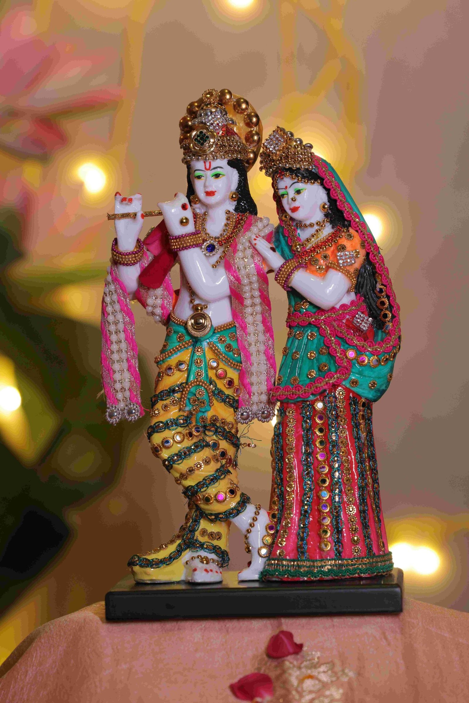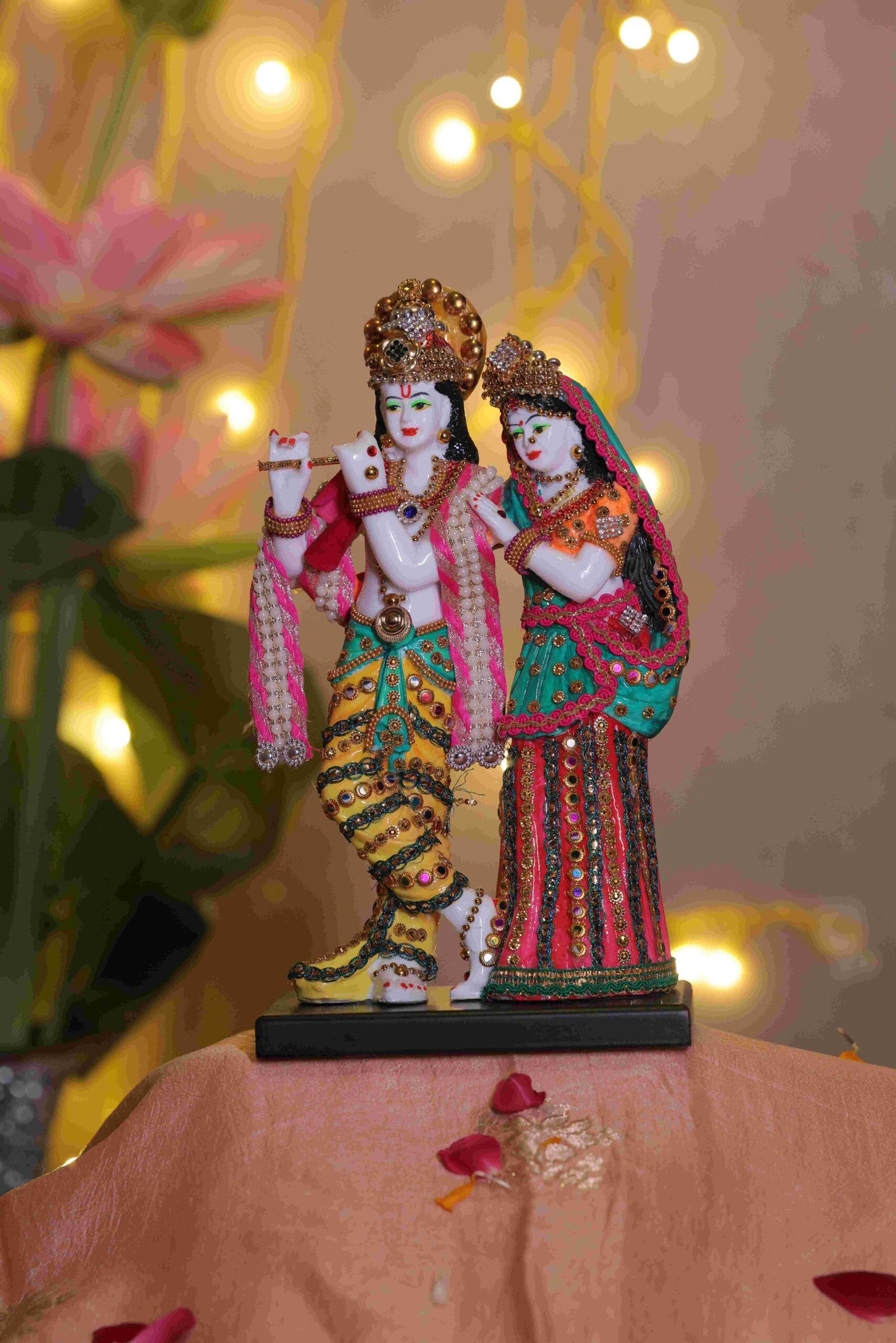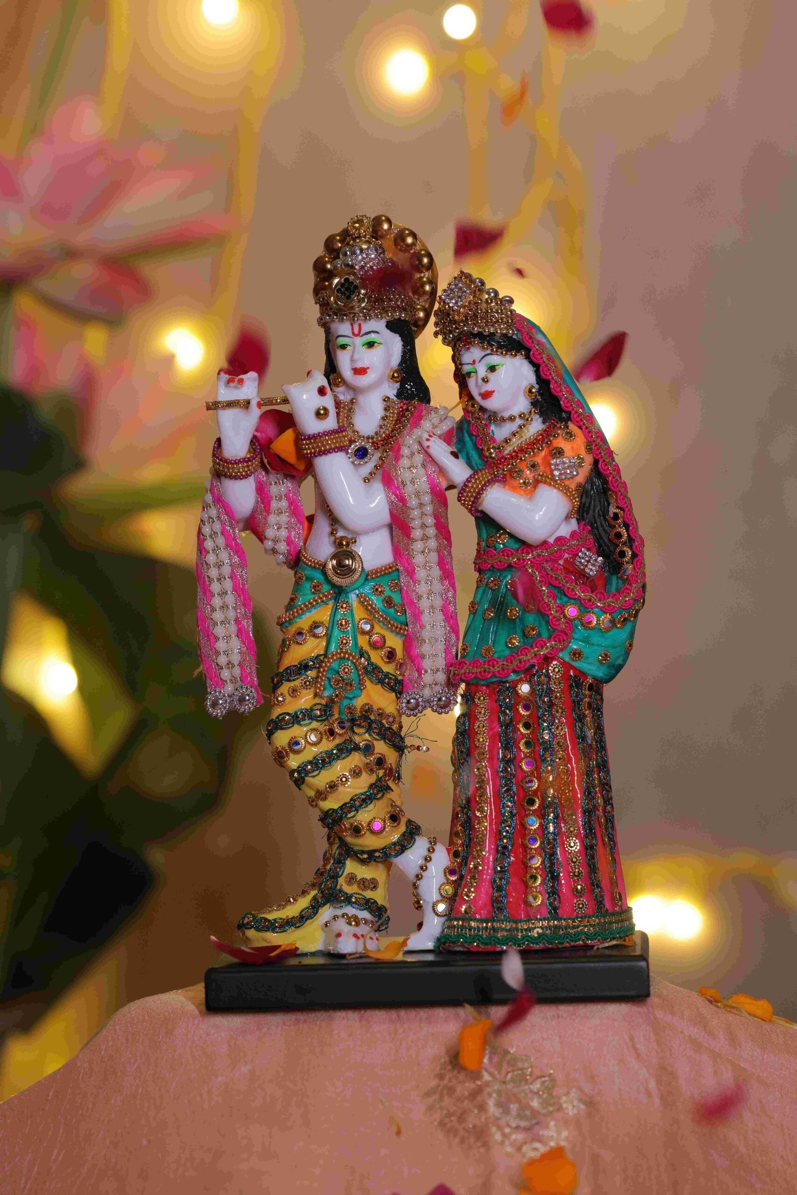 “Celebrate eternal love, devotion, and divine harmony with this exquisitely crafted Radha Krishna Idol, portraying Lord Krishna playing the flute alongside Radha, symbolising unconditional love, balance, and spiritual unity. The idol is adorned with intricate hand-painted detailing, vibrant traditional colours, and finely embellished attire that reflects timeless Indian artistry.