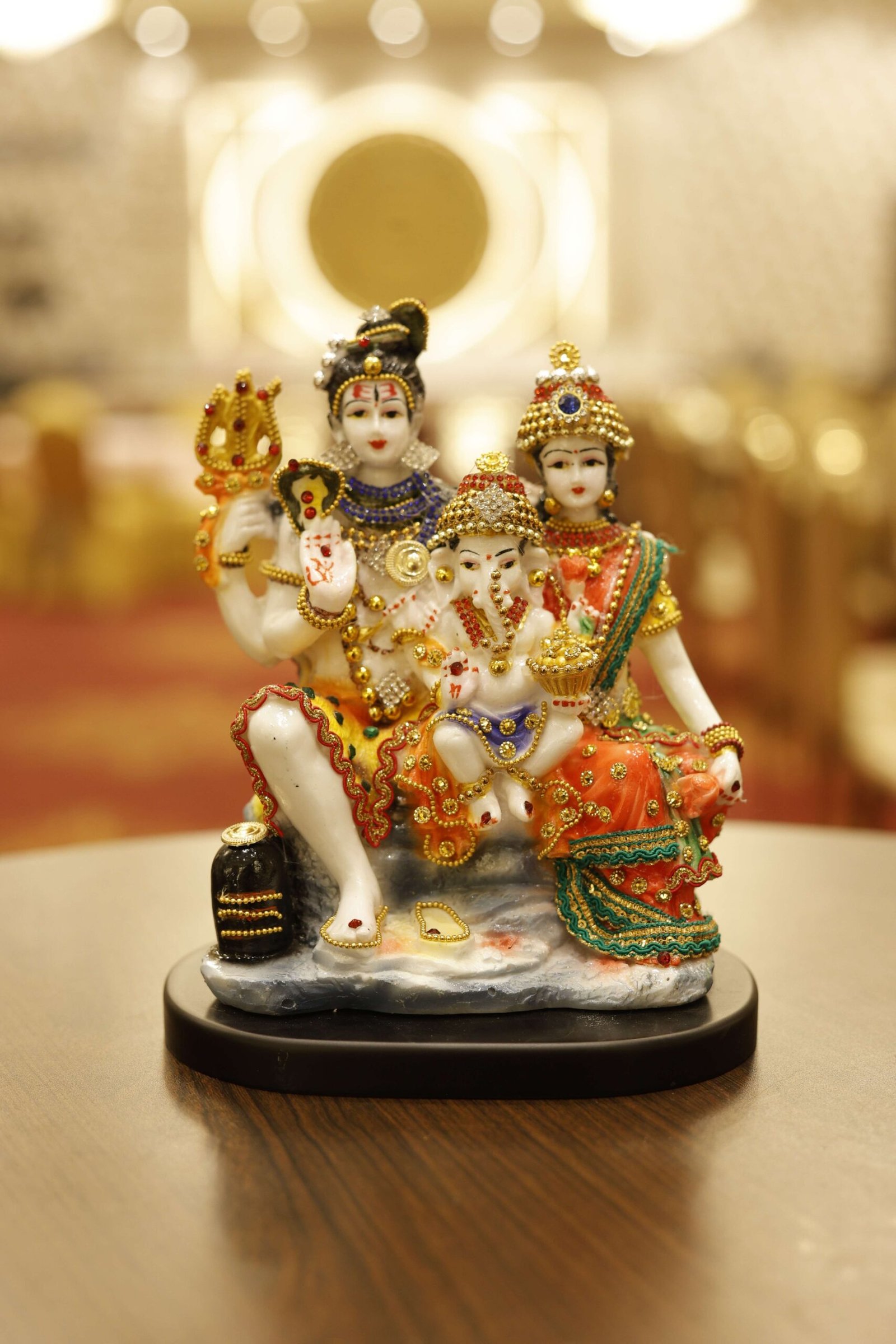 “This exquisitely detailed Shiv Parivar Idol depicts Lord Shiva, Goddess Parvati, and Lord Ganesha seated together in divine harmony, symbolising unity, balance, and auspicious family energy. Hand-painted in rich traditional hues and adorned with intricate embellishments, the idol reflects fine craftsmanship blended with devotional elegance. The compact yet striking form makes it ideal for both sacred spaces and thoughtfully curated interiors. Each element—from Lord Shiva’s trishul to Goddess Parvati’s serene posture and Lord Ganesha’s blessing gesture—adds depth, meaning, and visual grace to the composition.”
