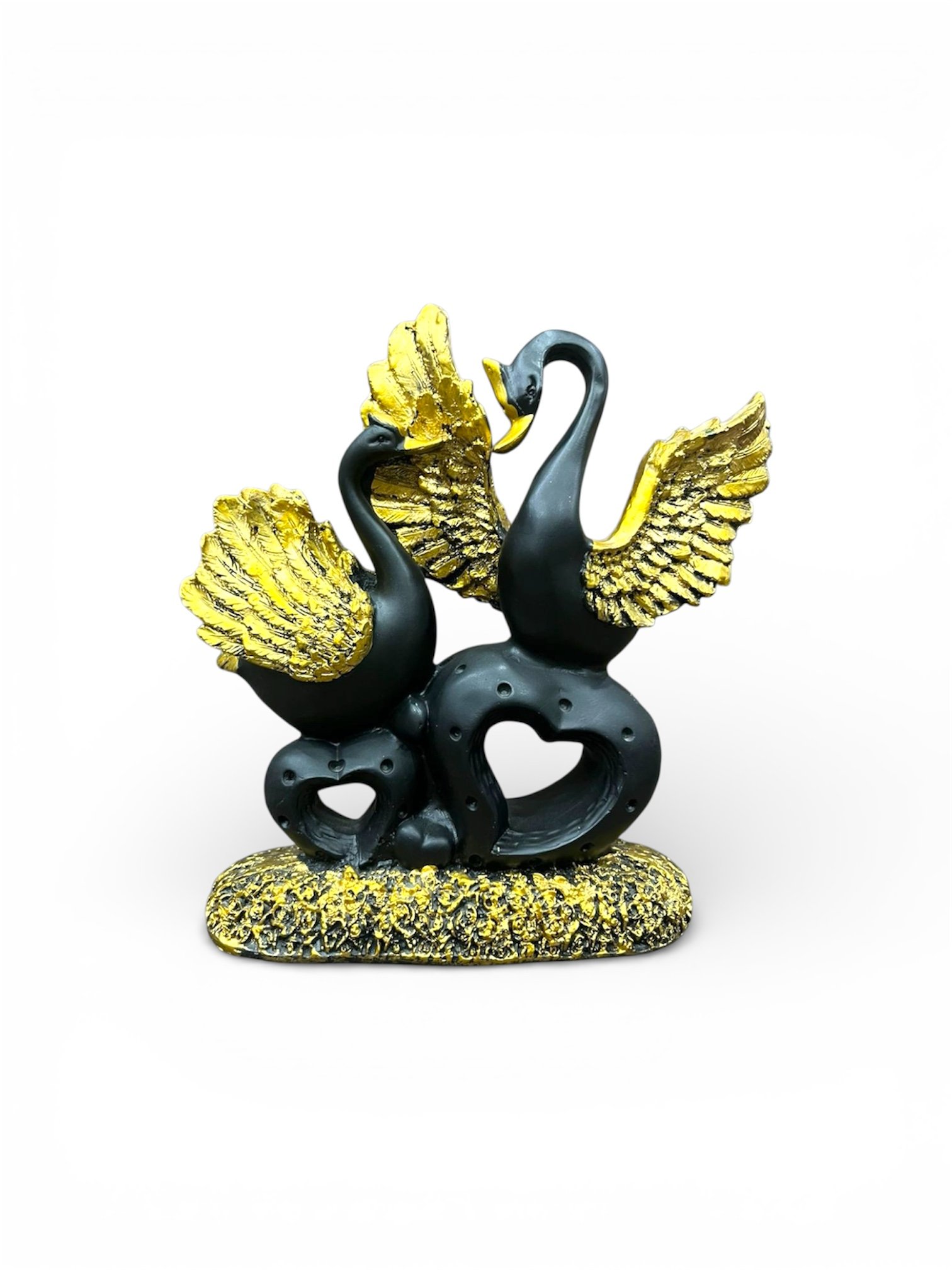 “Symbolising eternal love, grace, and soulful partnership, this Sacred Twin Swan Idol represents harmony and refined elegance. Swans are spiritually associated with purity, devotion, and lifelong companionship, making them a powerful symbol of balanced relationships and heartfelt unity. Crafted in a sophisticated matte black finish adorned with radiant gold wings and detailing, this sculpture beautifully blends modern luxury with romantic symbolism. The gracefully arched necks form a subtle heart shape, enhancing its emotional depth, while the textured golden base adds richness and visual contrast. The sculpted feathers and poised stance reflect refined craftsmanship and artistic finesse. Energetically, twin swans represent emotional harmony, loyalty, and loving communication. Their presence fosters warmth, connection, and peaceful vibrations within the space, creating an ambience of serenity and graceful luxury. Blending spiritual symbolism with contemporary décor aesthetics, this statement piece elevates interiors with bold contrast and refined charm. Whether styled as a centrepiece or accent décor, it radiates sophistication and soulful beauty.”
