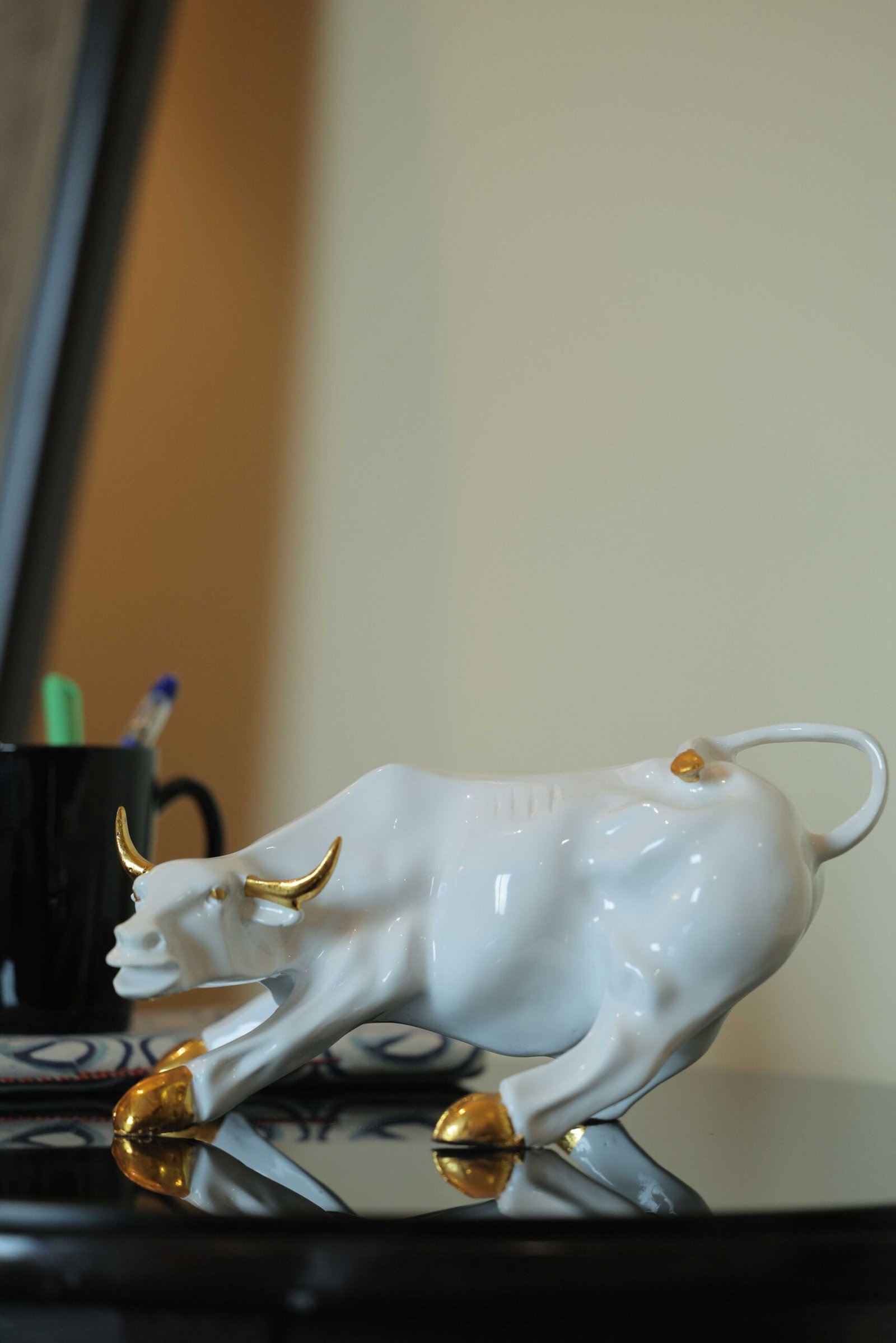 “This striking White Bull Idol symbolises strength, determination, and forward momentum, beautifully captured in a dynamic posture. Finished in a smooth white tone with refined gold accents on the horns and hooves, the piece blends contemporary elegance with symbolic depth. The poised stance of the bull reflects resilience, confidence, and progress, making it a powerful décor statement for modern interiors. Its sleek form and polished finish allow it to seamlessly complement workspaces, living rooms, and executive settings while adding a bold yet tasteful presence. Perfect for those who appreciate meaningful décor that conveys power and ambition without being overpowering.”